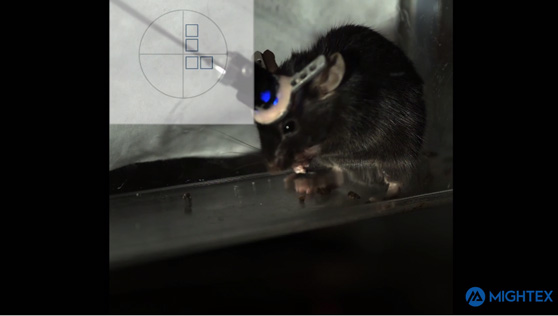 This video features the OASIS Implant being used in combination with Mightex’s Polygon to deliver targeted optogenetic stimulation to the cortex of a freely behaving mouse. When the optogenetic stimulation is localized within a specific region in the lower right quadrant the mouse responded with coordinated motor movements resembling a natural behavior. However, when the optogenetic stimulation is localized within a region in the upper right quadrant, the mouse exhibits a different behavior.